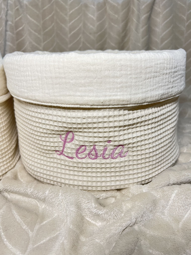 Panier confectionné avec du tissu nid d'abeille et du tissu double gaze.